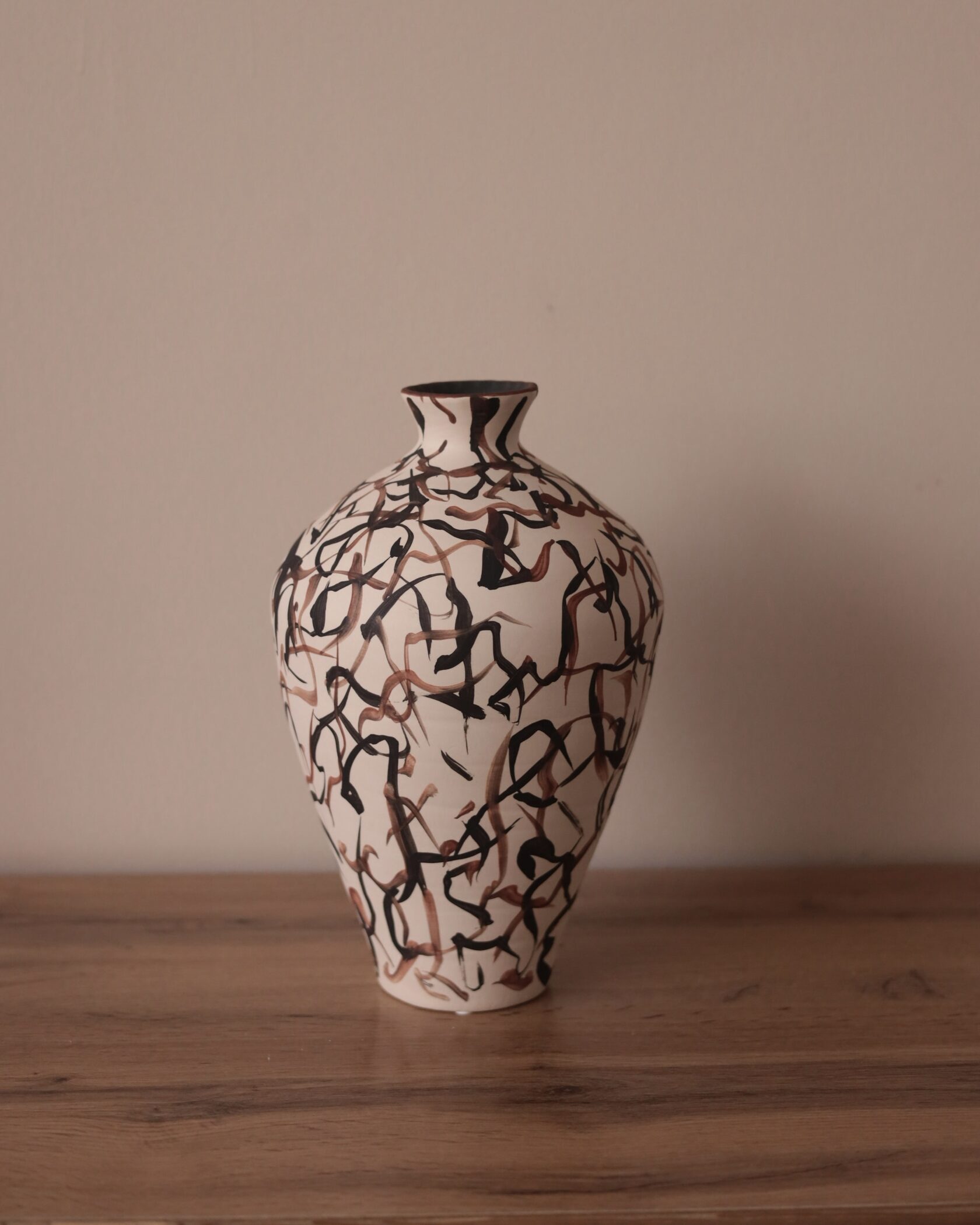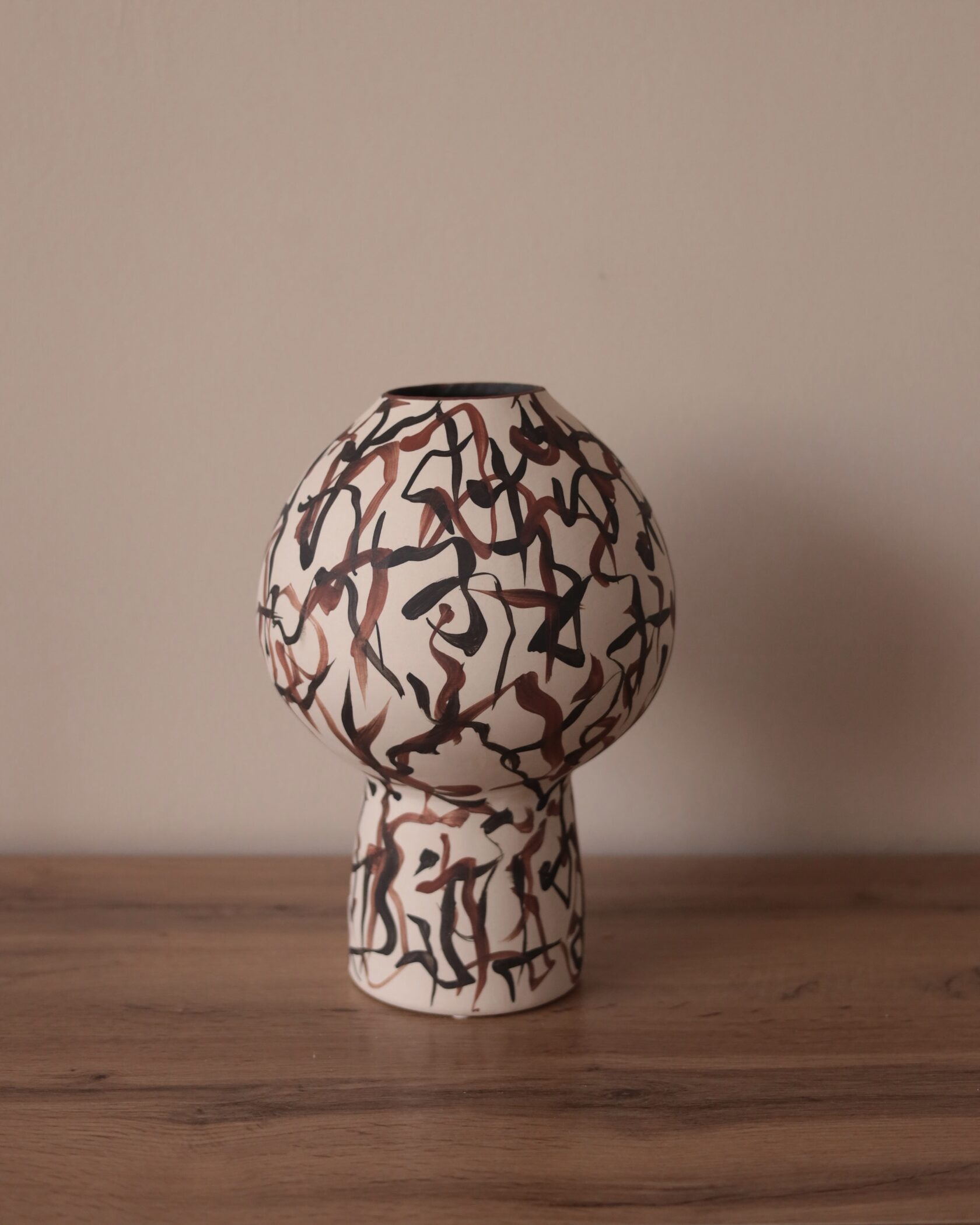 Графичный ручной рисунок создаёт ощущение ритма и внутренней динамики, словно форма продолжает двигаться даже в покое. Эта ваза не требует цветов — она работает как самостоятельный арт-объект, задающий характер всему пространству.