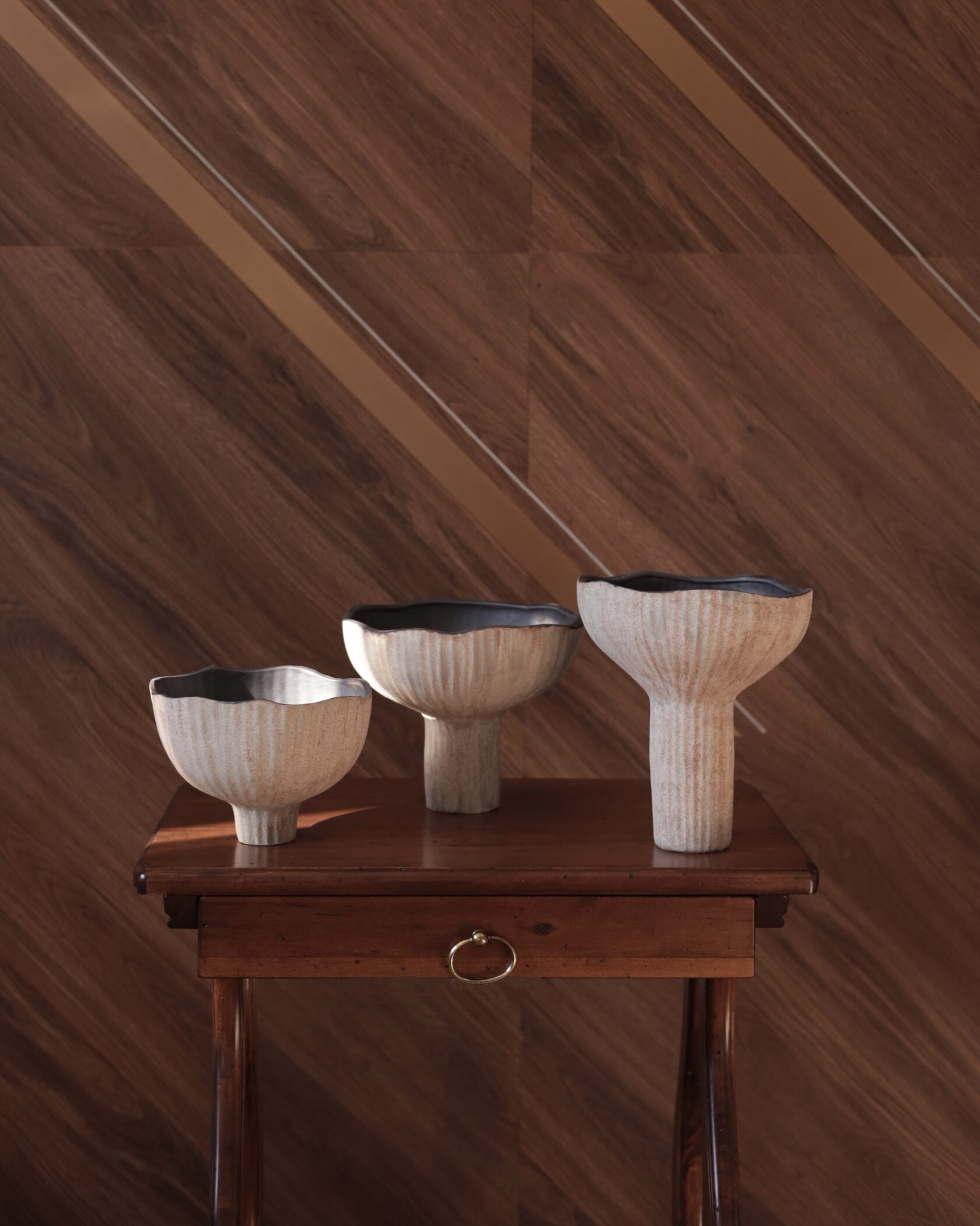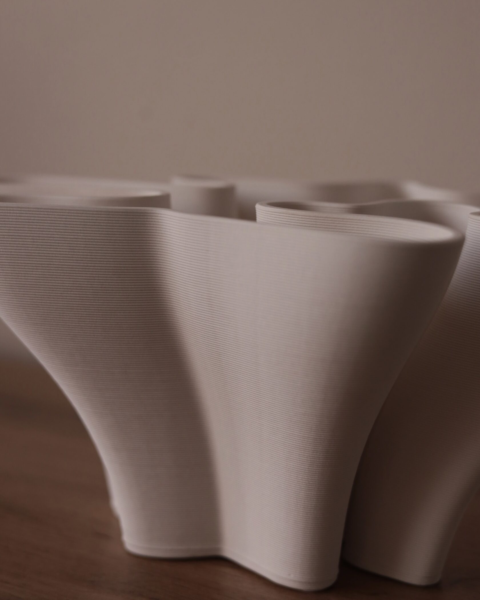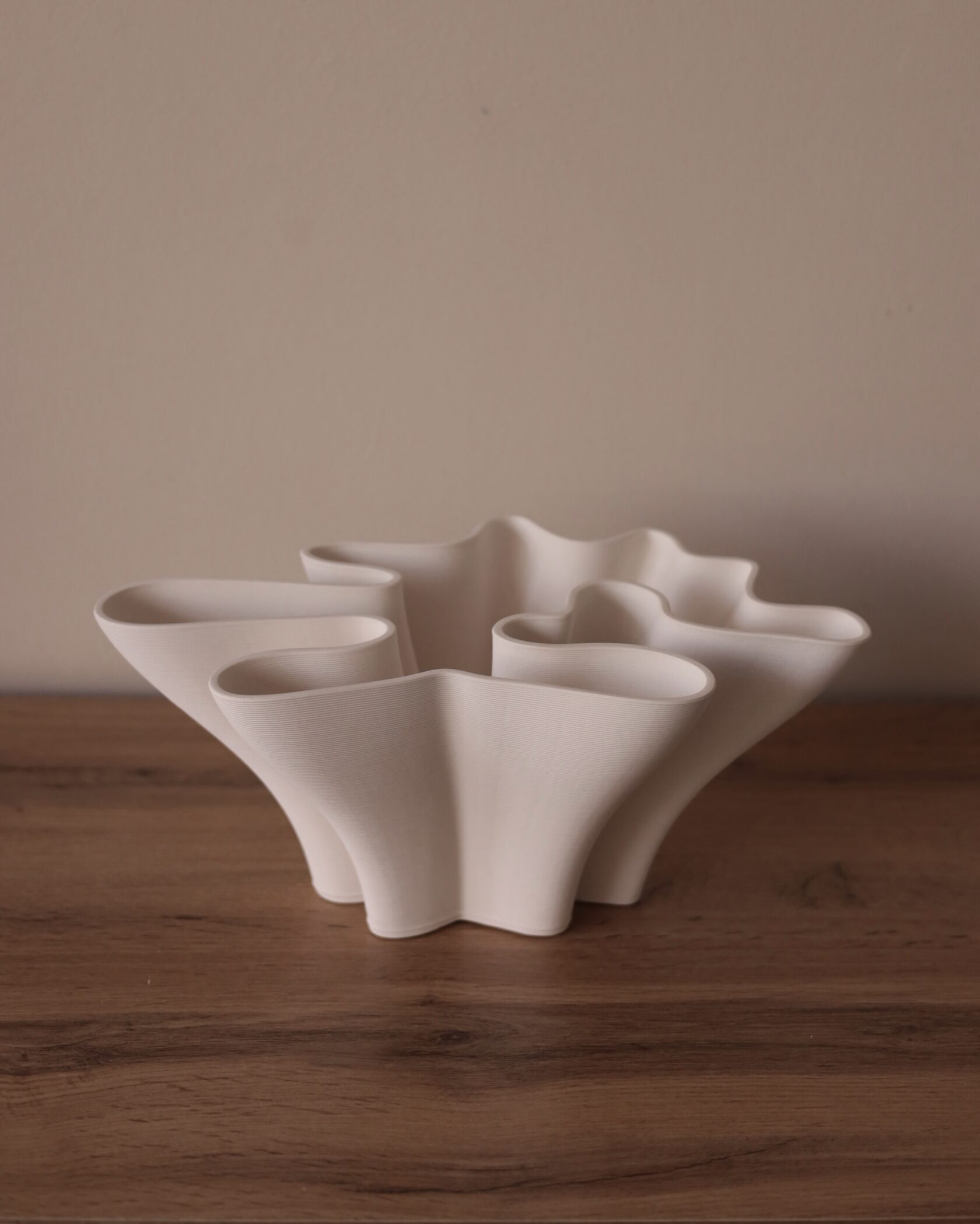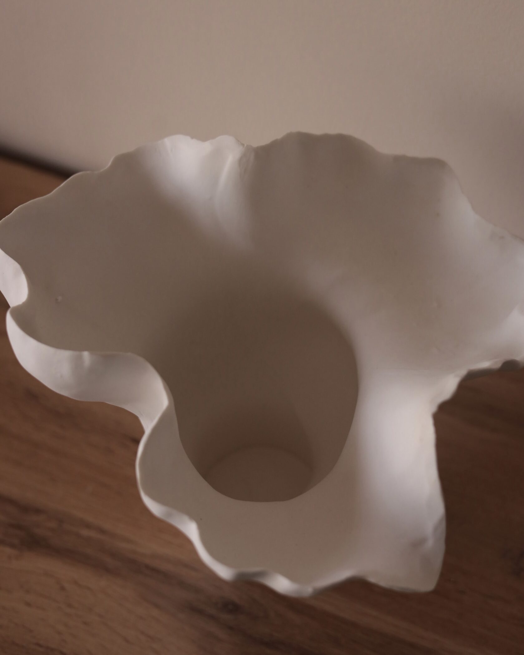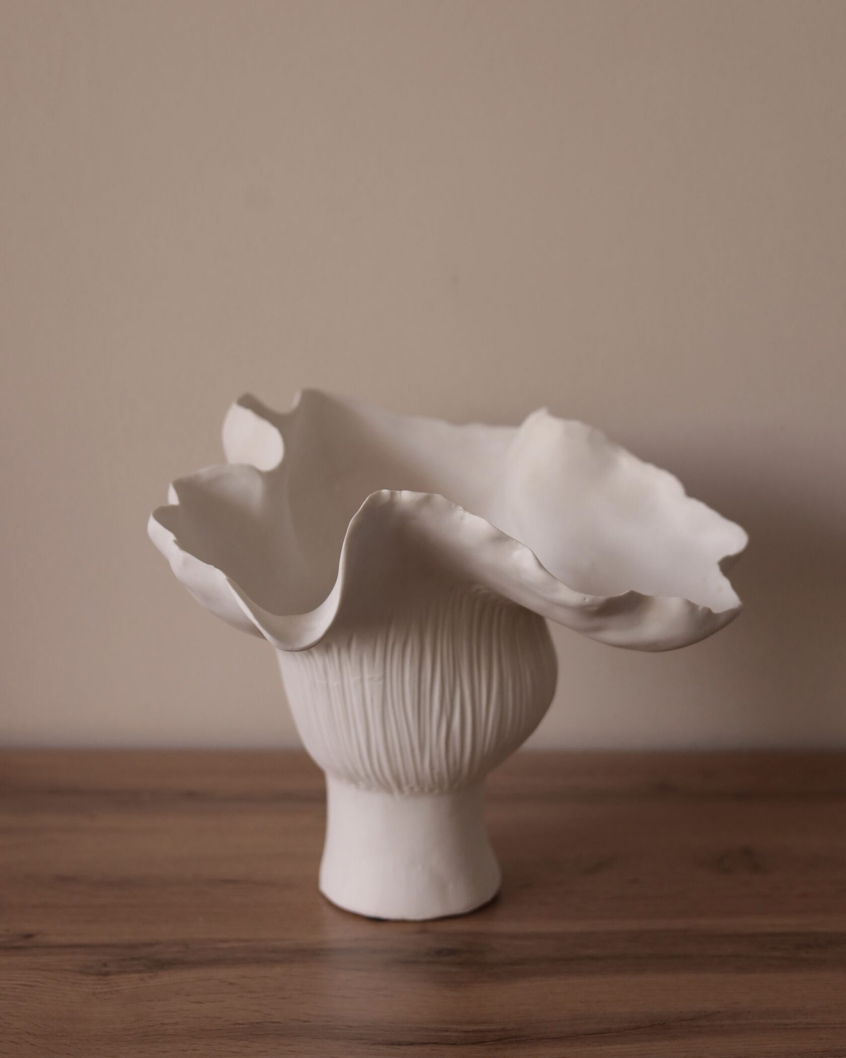 Легкая рябь на стенках, похожая на след от ветра на воде, и мягкий волнистый край, напоминающий распускающиеся лепестки