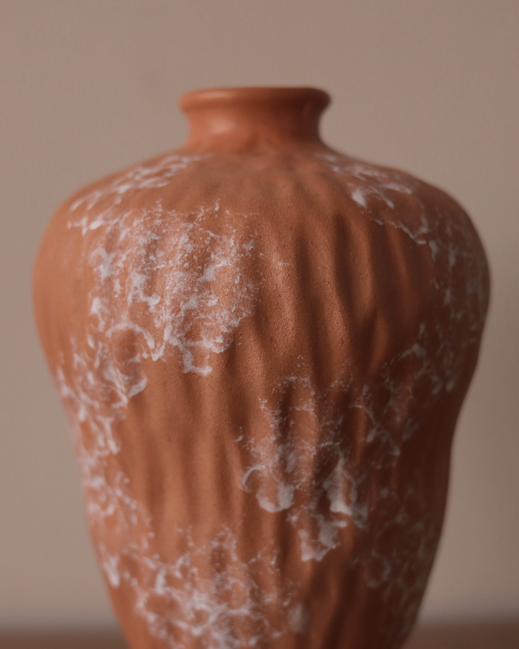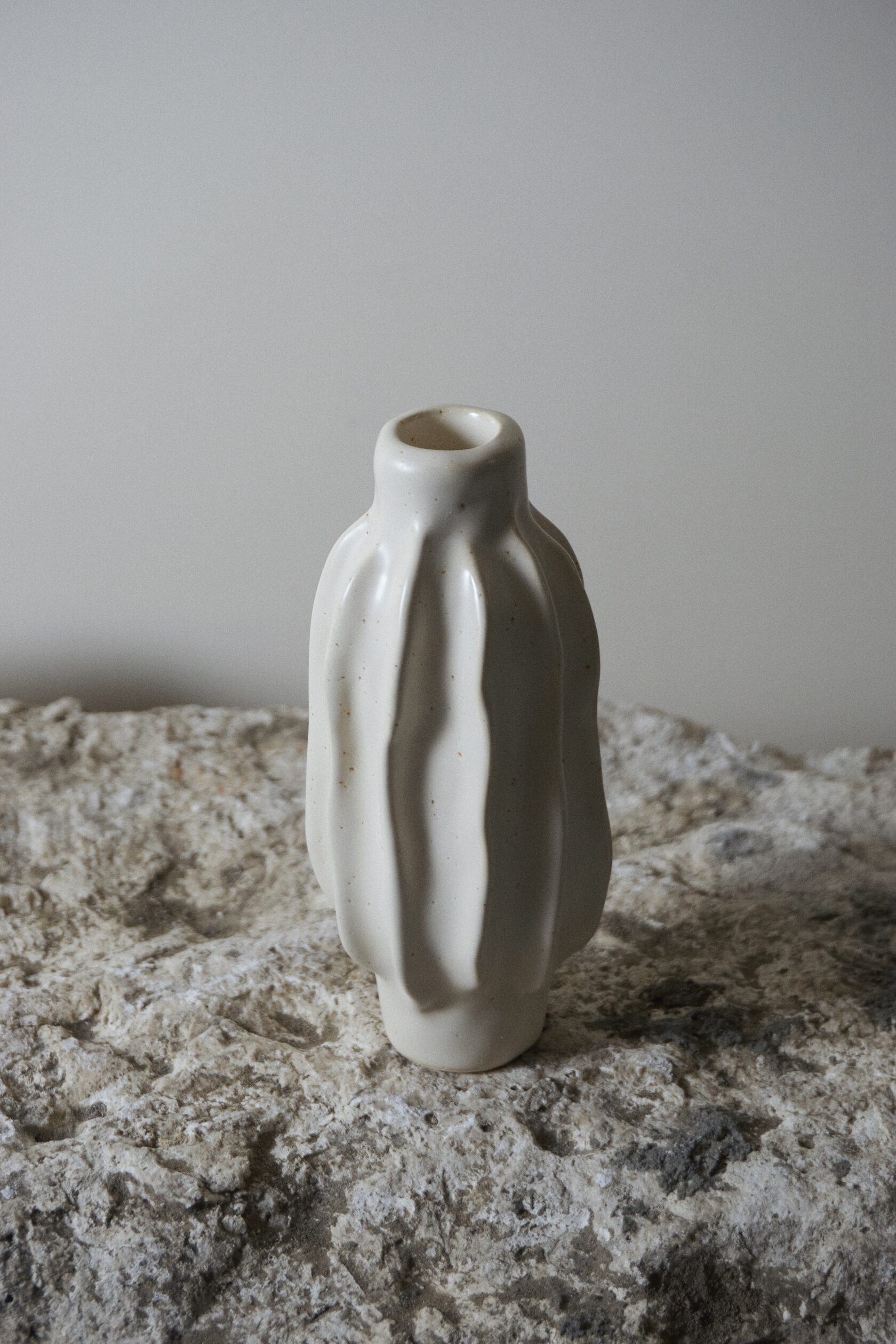 Вытянутая керамическая ваза с благородной матовой фактурой и естественным оттенком, подчёркивающая чистоту формы и тактильную выразительность материала